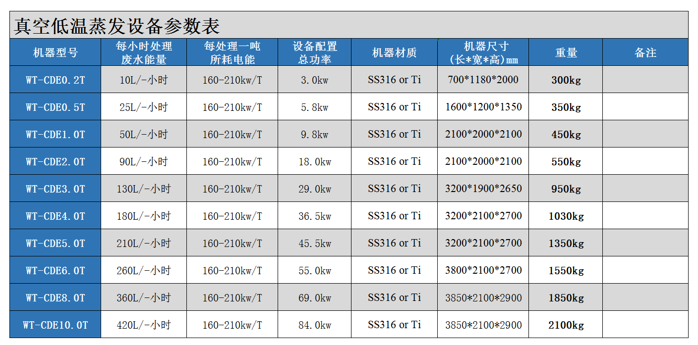 WT-CDE(200L-5000L)是一種利用熱泵的真空蒸發器,全自動控制。特別適用于高危廢水減量化。蒸餾水產量約為200-5000升/天,真空保持約-96KPar,蒸發溫度保持35℃左右,能源為電和排液需要壓縮空氣。